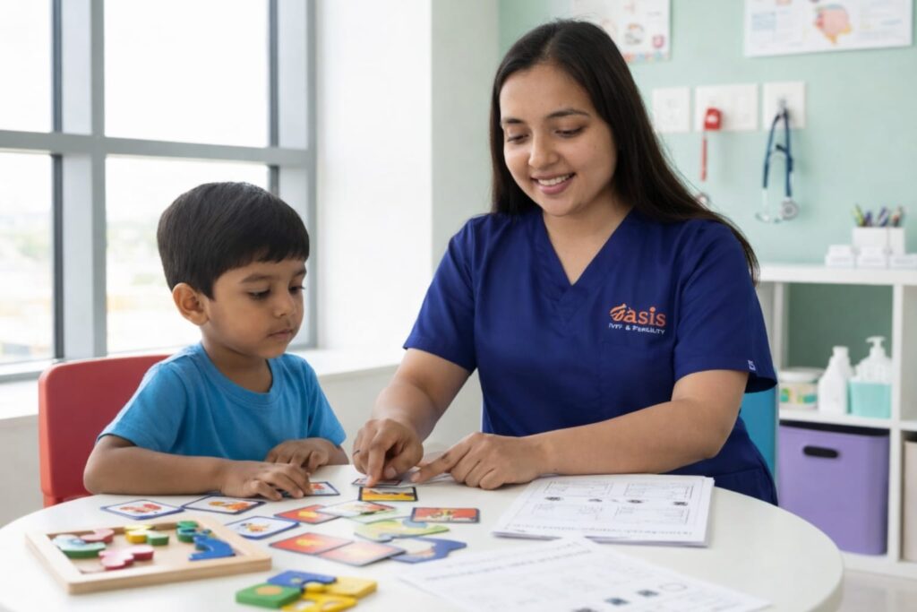 If your child isn’t meeting age-appropriate milestones—like not babbling by 12 months, having a vocabulary of fewer than 50 words by age 2, or struggling to form sentences by age 3—it is time for an assessment. We also look for signs like stuttering, trouble socializing, or difficulty following instructions. (Why this works: It gives specific red flags, prompting the parent to act.)