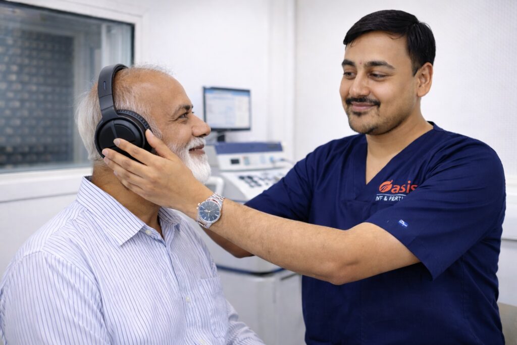 A hearing aid is a medical device, not an electronic gadget. Buying online often results in poor sound quality and noise issues. At Oasis, a Master’s qualified Audiologist performs a precise Pure Tone Audiometry (PTA) test and programs the device to match your specific hearing loss graph, ensuring you hear speech clearly, not just noise.